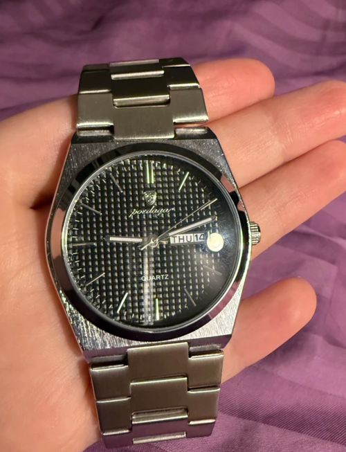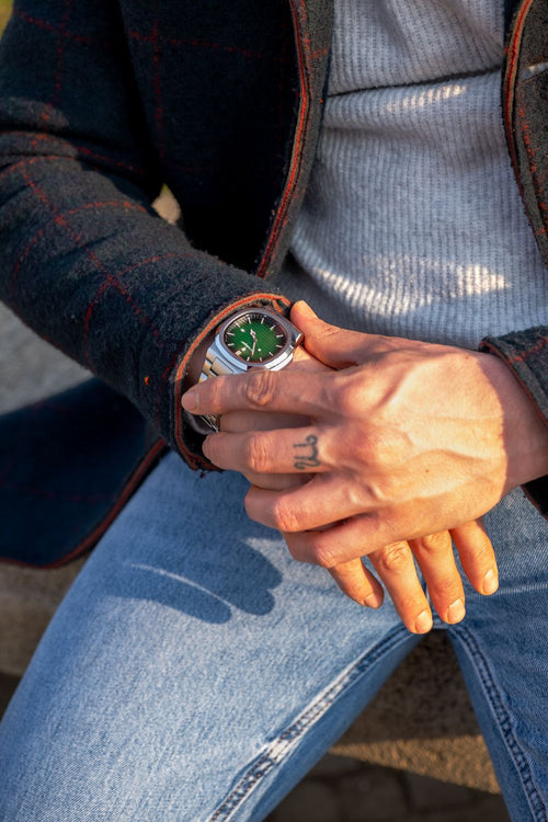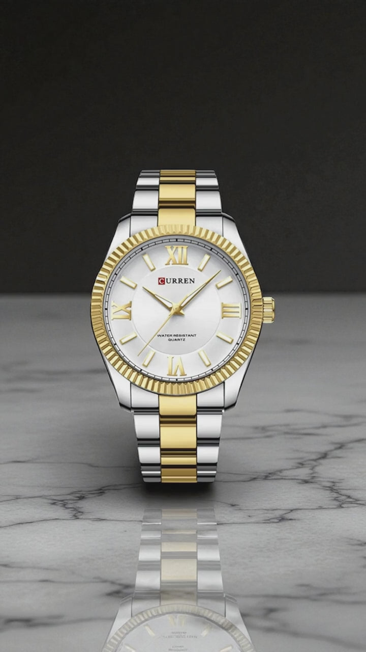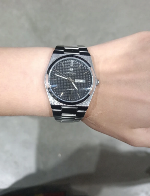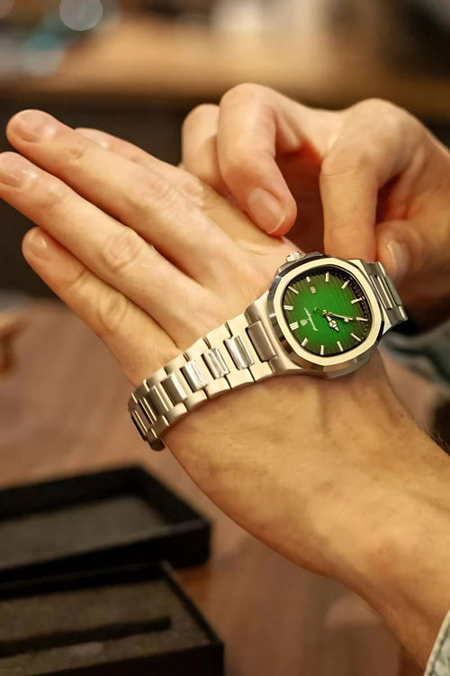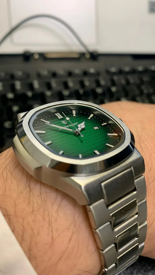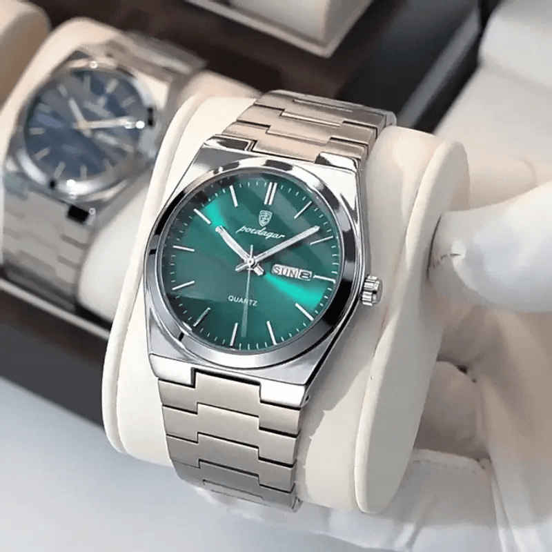 La caja y la correa están hechas de Acero Inoxidable de alta calidad, garantizando un tacto premium y una larga vida útil. La hora se ve siempre perfecta gracias al movimiento de Cuarzo preciso y al espejo de Vidrio Mineral Reforzado, resistente a arañazos.